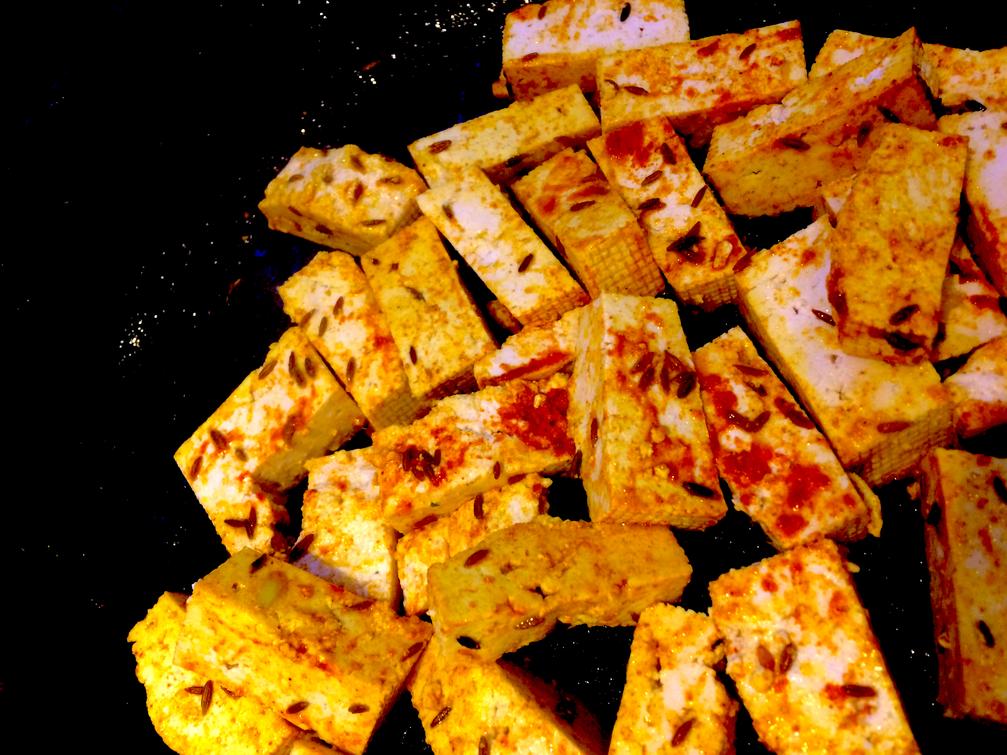 De plus, j’utilise des graines de cumin pour relever encore le goût du tofu.